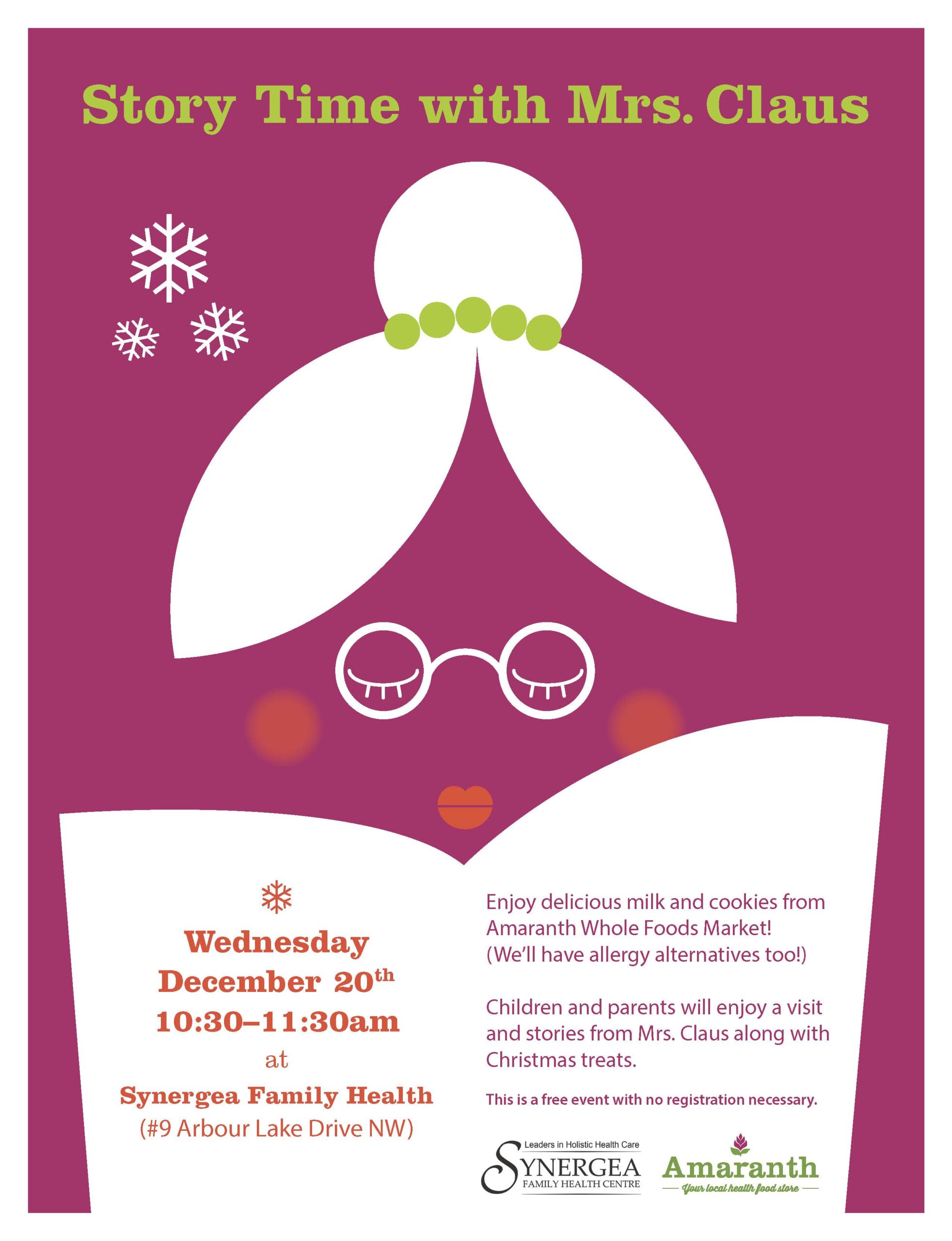 Mrs. Claus will be making her annual visit to Synergea Family Health Centre for story time. Amaranth will be supplying delicious milk and cookies (allergy alternatives too) to enjoy while she reads. Mark your calendars with the date and we will see you soon!